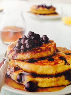 1. Combine all ingredients except for blueberries in a blender and blend for 30 seconds, or until oats are fairly smooth. Pour batter into a bowl and let rest for 10-15 minutes or until slightly thickened. Fold blueberries into batter.