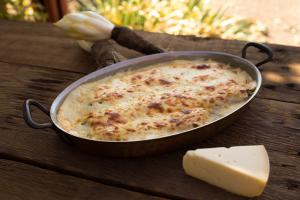 In a saucepan melt butter then whisk in flour to create a smooth roux, stirring constantly while cooking 1-2 minutes over a medium low heat. Slowly add the milk, again whisking constantly. Increase the heat slightly and cook until smooth and thick. Season the sauce with nutmeg and ¾ of the grated gruyere, whisking the cheese into the still warm sauce until melted.