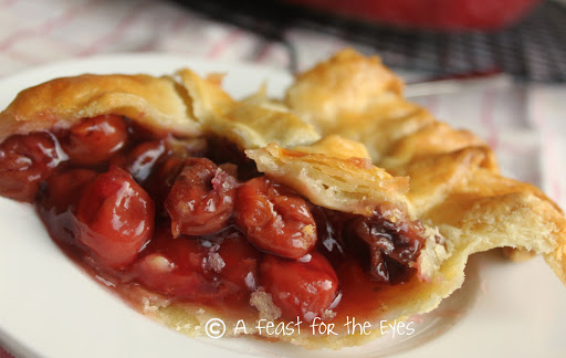 This is the first time I've made a cherry pie, with homemade cherry pie filling. I wish that Sour Cherries were available year round, but I used canned cherries in water. The pie crust is a Pate Brisee, which is a French version that uses all butter. I have made plenty of pies over the years, but this one-- according to my family (and they are honest critics)-- is the BEST pie I've made so far. I have to agree. The cherries were just the right balance of tart and the crust was so tender. Please click on the recipe source that links to my food blog "A Feast for the Eyes". You can see how I made this pie. You will love it! (Pie recipe slightly adapted from King Arthur Flour and the crust is from Martha Stewart)