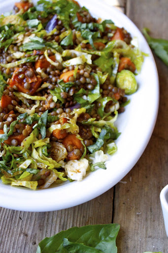 Once the cooking gets underway, shred your Brussels sprouts and prepare the dressing. While the lentils are still warm, toss them in a little of the dressing – this will mean the lentils get well coated in flavor before they cool – making them (IMO) extra delicious.