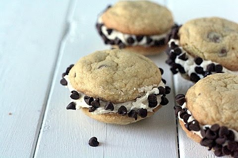 Once cookies have cooled begin making the sandwiches. Place a spoonful (as much or as little as you want) on the flat side of one cookie, and sandwich it with the flat side of another cookie. Repeat until all cookies are gone. Coat sides with mini chocolate chips if desired.
