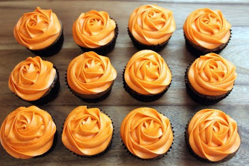 I placed the orange frosting in a piping bag with a #2D tip and started piping the rose shape in the center and swirled the frosting about two times around the center to create the rose. The green stems I applies with tip #66.