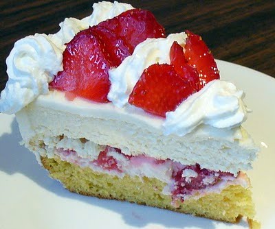Frost the cake with the cream cheese frosting*. (Or whatever kind of frosting you want. A pink strawberry frosting would taste great too!)Slice and top with strawberries and whipped cream. I would recommend making this for a larger dinner party because the strawberries in the middle could get soggy if left more than a couple days without eating it all. But that may be rather unlikely since I'm sure there will be people asking for seconds.