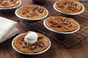 MIX pumpkin, spice, remaining sugar and egg until well blended; spoon over Neufchatel layers in tart shells. Sprinkle with nuts.