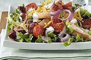 Toss greens with chicken breast strips, cheese, tomatoes and onions.