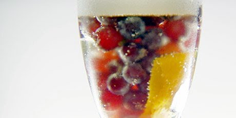 Pour the crème de cassis into glass and fill with bubbly (to come ¾ way up the glass). Garnish with fresh fruits.