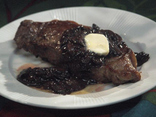 Let the liquid reduce by half, 7 to 8 minutes. Remove from the heat and swirl in 3 tablespoons butter to finish the sauce. Serve the steak with mushroom red wine sauce drizzled over the top.