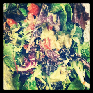 In the salad above I poured it over my usual base--greens, tomato, avocado--and ate it immediately. Store in the frig until ready to eat. It's best to pour over greens and eat immediately (do not let sit) as the citrus in the orange juice will wilt the lettuce rapidly.