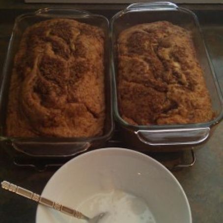 Place the first six ingredients together in a mixing bowl and blend on high for 8 minutes. I love my KitchenAid blender, it makes everything so much easier. Grease two loaf pans generously with Pam. Fill each pan half way and then sprinkle the cinnamon/sugar blend in a layer. Then top off with the rest of the batter and sprinkle the loaf with the remaining sugar blend. I swirled a knife thru each loaf to marble the cinnamon throughout and to make it pretty when it is cut. I then baked the loaves for 45 minutes in a 350 degree oven. Cool and then glaze with frosting.