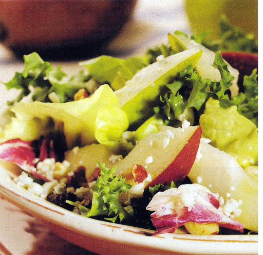 Scatter cheese over the salads and arrange 4 pear slices around each one. Serve immediately. Makes 4 servings.