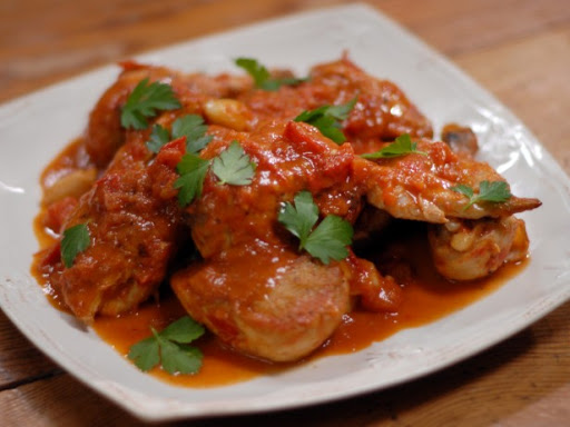 *Return* the chicken to the pan and add the tomatoes and tomato paste and the bouquet garni and simmer, uncovered, until the meat falls from the bone, about 30 minutes.