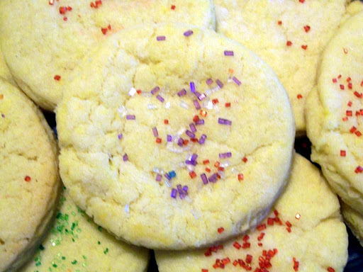 Roll to about 1/2 inch thickness and cut cookies with a glass or cookie cutters. Bake at 350 F until lightly brown, about 12 minutes. Sprinkle with sugar or cool and frost.