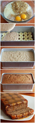 Spread the brown sugar on the bottom of the loaf pan. If using nuts, sprinkle them evenly over the sugar. Dot with the butter. Put it in the oven for about 8 minutes. Stir the mixture until dissolved and spread evenly on the bottom of the pan. Place a single layer of the banana slices on top of the sugar mixture along the entire bottom of the pan.