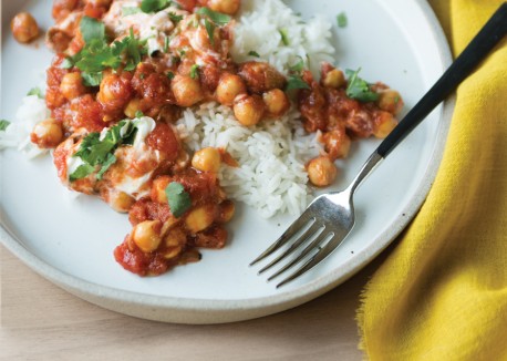 2. Stir in chickpeas and tomatoes. Bring to a boil, reduce heat to medium-low, and simmer 15 minutes. Remove from heat, and stir in yogurt and cilantro.