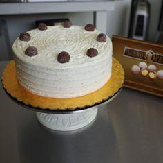 2. Use a serrated knife to trim the tops off of each of the cake rounds. Place one of the rounds on your cake decorating turntable and spoon approximately ¾ cup of the buttercream onto the middle of the cake round. Using an offset spatula spread the buttercream until it overhangs the edge of the cake just slightly. Sprinkle approximately half of the broken macadamia nuts on the buttercream. Place the next layer on top, pressing down slightly, and repeat with the buttercream and the rest of the broken candy pieces.