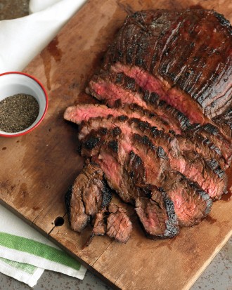 Heat grill to high. Remove steak from marinade, letting excess drip off. Pour marinade into a saucepan and simmer over medium-high heat until reduced by half, about 10 minutes.