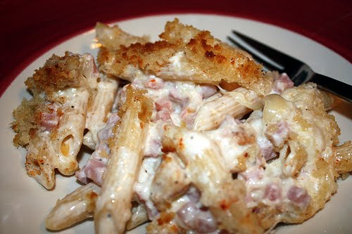Transfer pasta to a baking dish and top with Panko crumbs. Pour melted butter over crumbs and broil until browned (I gave it 4 minutes).