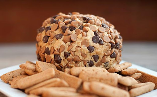 Freeze for 1 hour and 30 minutes or until the cheese ball is firm enough to keep its shape. Place peanut butter and chocolate chips on a plate. Remove the plastic wrap from the ball and roll it into the chocolate and peanut butter chips to completely cover, pressing them into the ball if necessary.