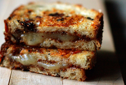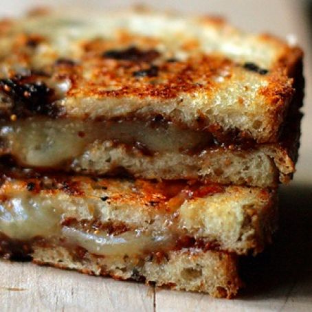 Lightly spread both sides of all bread slices with butter. Spread each slice with about 1-2 tablespoons dried fig jam, just enough to barely cover the bread. Mound about half a cup of shredded Manchego cheese on top of the fig spread on one slice of bread, then the other half of the cheese on another slice of bread. “Close” the sandwich with the other two slices of buttered, fig-ed bread.