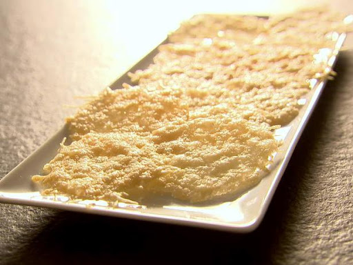 Grate 2 ounces of the Parmesan using the side of the box grater that finely grinds the cheese and then grate 2 ounces of the Parmesan using the side of the box grater that makes long shreds of cheese, and then mix them together. Drop rounded tablespoons of the grated Parmesan on the parchment paper to make neat mounds. Bake in the oven for 6 minutes until golden.