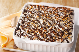 TOP cake with marshmallows. Broil 30 sec. to 1 min. or until marshmallows are golden brown. Melt chocolate squares as directed on package; drizzle over marshmallows. Cool cake 15 min.