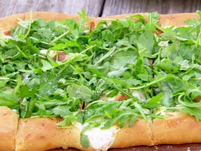 Put the arugula, whole basil leaves and parsley in a bowl and toss with the extra-virgin olive oil and balsamic vinegar. Scatter over the pizza, sprinkle with grated Parmesan and serve.