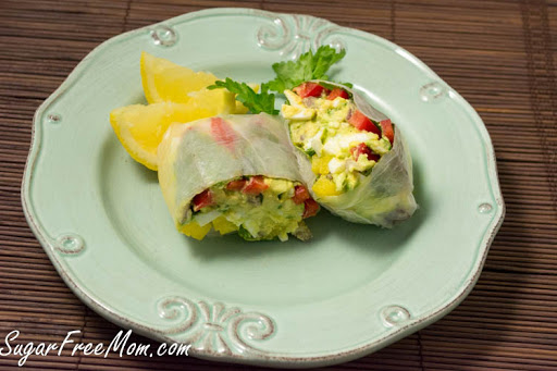 Scoop half the egg avocado mixture onto the peppers and roll up each side.