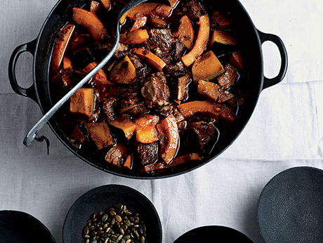 Serve stew with red onion, cilantro, and reserved pumpkin seeds.