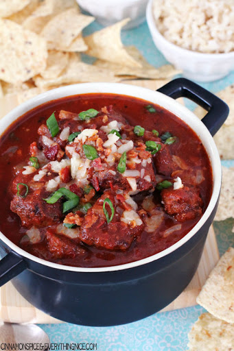 Chili con carne with hearty hunks of beef slow cooked in tomatoes with a ton of spices, bacon, garlic, onion, chipotle and jalapeno peppers. No beans allowed. Not in this chili. This chili is a celebration of meat.