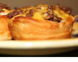 Flatten each biscuit, and press into cups of the prepared muffin pan. Make sure the dough comes to the top of the pan. Spoon a portion of the meat mixture into each dough cup.