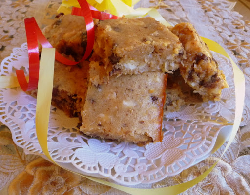 In food processor, prepare Condensed Milk and add peanut, OR almond butter and eggs. Process until smooth. In large bowl, combine ground almonds, chocolate chips, OR a combination of white and dark chocolate chips, coconut and prunes. Stir in condensed milk mixture. Stir to combine well. Pour into parchment-lined 9 x 13-inch (2 L) glass casserole dish and spread evenly with the back of a dessert spoon. Bake in 350°F (180°C) oven 20 minutes, or until set and cake tester comes out clean.