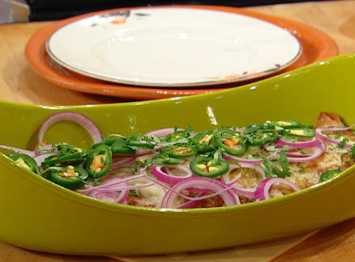 Dollop a few tablespoons of the cheese mixture onto each tortilla and roll up like a cigar (you will use about half to two-thirds of your filling). Arrange the enchiladas in a single layer in a casserole dish. Cover with the remaining cheese mixture and bake until golden, about 15 minutes. Top with the jalapeos, red onions, whole cilantro leaves and lime juice.
