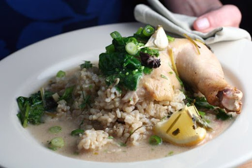 Put your chicken back in the pot with the cinnamon stick, star anise, a handful chopped cilantro stems (about 1/2 cup), lemon, lemongrass, garlic and coconut milk and cook in the preheated oven for 60-90 minutes (depending on size), basting the sauce over the top of the bird every 20 minutes or so. The chicken is done when an instant-read thermometer inserted into the thigh reads 165° F.