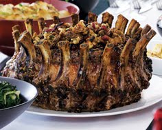 Crown roast of pork is a spectacular holiday meal. The roast is about a 12- to 16-rib piece of meat because you need 2 ribs, tied end-to-end, to produce the crown. A butcher will do this for you. Pork can be dry so slow-roast the meat to keep it tender and juicy. Cook the stuffing separately because a stuffed roast takes longer to cook and the meat and the stuffing both suffer. Make sure the butcher frenches the bones for you (cuts away the meat and fat on the bones to make them clean). Serve with a potato gratin, Swiss chard and roasted cauliflower.