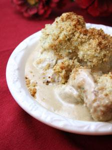 In a separate bowl, add the melted butter to the bread crumbs and mix well. Drop biscuit batter by teaspoonfuls onto the casserole and sprinkle with the buttered bread crumbs. Place the casserole in a preheated 350-degree oven and bake for 25 minutes or until the biscuits are cooked throughout and lightly browned.