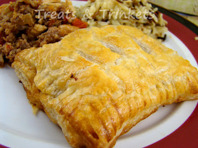 Put about 1½-2 tbsp. of the meat mixture on one of the pastry squares. Brush the edges with water and top with a second square.