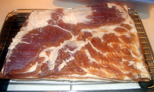 WHEN THE BACON IS CURED RINSE IT THOROUGHLY, PLACE ON A WIRE RACK LETTING IT AIR DRY.