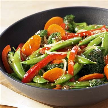Heat oil in a wok or large skillet over medium-high. Add garlic and ginger and cook 1 minute. Add chicken and cook until starting to brown, stirring constantly. Add onions, carrots, and peppers and cook 1 minute. Add snap peas, corn and broccoli and bean sprouts cook 2 minutes. Add soy sauce and cook 2 minutes, until vegetables are crisp-tender.