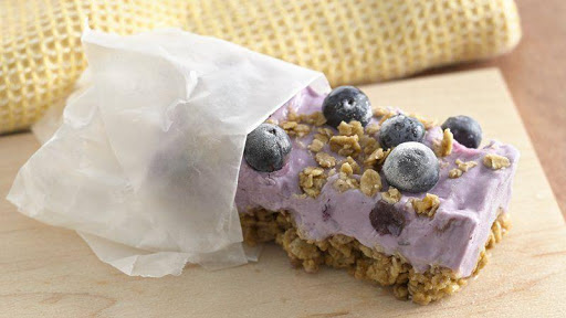 Spoon yogurt over crust; gently spread to cover. Sprinkle with blueberries and crushed granola. Freeze about 3 hours or until firm.