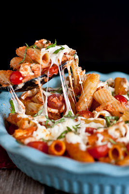 Drain cooked pasta well, return pasta to pot. Add in grilled diced chicken, grape tomatoes, half of the mozzarella and half of the basil ribbons, then pour warm sauce over mixture. Toss to evenly coat. Pour mixture into a greased casserole or baking dish. Sprinkle with remaining mozzarella and cook pasta uncovered for about 20 - 25 minutes until cheese is golden. Serve warm sprinkled with remaining fresh basil.