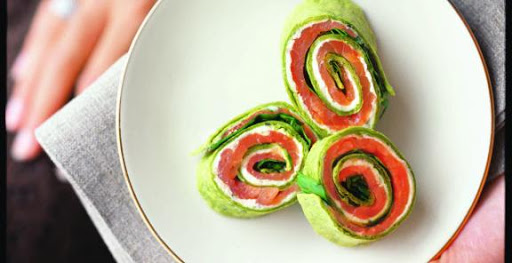 1. Mix cream cheese spread and feta cheese until well blended; spread onto tortillas. Top with salmon and spinach.