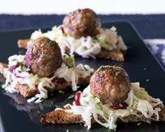 5. To serve, melt 1 tbsp (15 mL) of butter in a frying pan over medium heat. Add meatballs in a single layer; cover and heat for 5 minutes or until hot. Meanwhile, slice bread thinly; toast and then butter. Cut into 2-inch (5-cm) squares or similar-sized triangles. Arrange a spoonful of sauerkraut mixture on bread, top with a meatball. Scatter with parsley.
