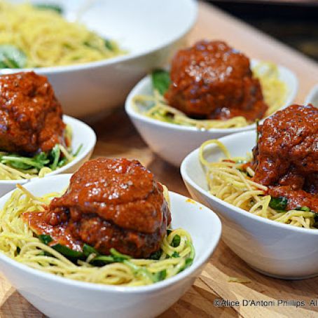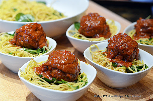 This meatball and sauce have a unique flavor, and, yes, you distinctly know they’re not Italian~~the harissa and use of pineapples create something that immediately tells your palate that you’re happy! You can serve these meatballs with your choice of pasta as you see I’ve done here w/angle hair pasta and with ravioli that I just happened to have on hand, too! These meatballs would make a mean sandwich, too!