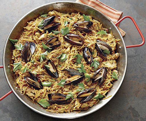 Push the mussels into the fideos at even intervals. Bake until the mussels open, 3 to 5 minutes. Transfer the mussels to a plate and cover with foil to keep warm.