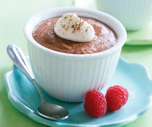 Top the mousse with a dollop of whipped cream or crème fraîche and sprinkle with cocoa powder, if desired. Garnish with fresh raspberries or strawberries.