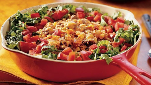 3 Fluff rice mixture with fork; sprinkle with cheese. Cover; let stand 1 to 2 minutes or until cheese is melted. Sprinkle lettuce around edge of skillet; sprinkle tomato in circle next to lettuce. Serve with sour cream.