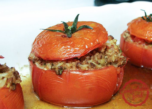 Fill the tomatoes with the meat filling and arrange in a casserole dish. Top each tomato with its lid and drizzle with the remaining olive oil.