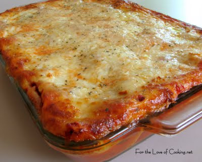 Bake covered in a preheated oven at 375 degrees for 30 minutes. Uncover and bake for 15 minutes. Let cool for 5 minutes before slicing. Enjoy.