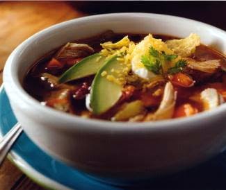 Serve hot topped with avocado, sour cream, cheese and tortilla chips.