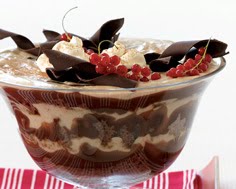 7. To serve, spread reserved whipped cream over trifle and garnish with cinnamon and chocolate shavings.